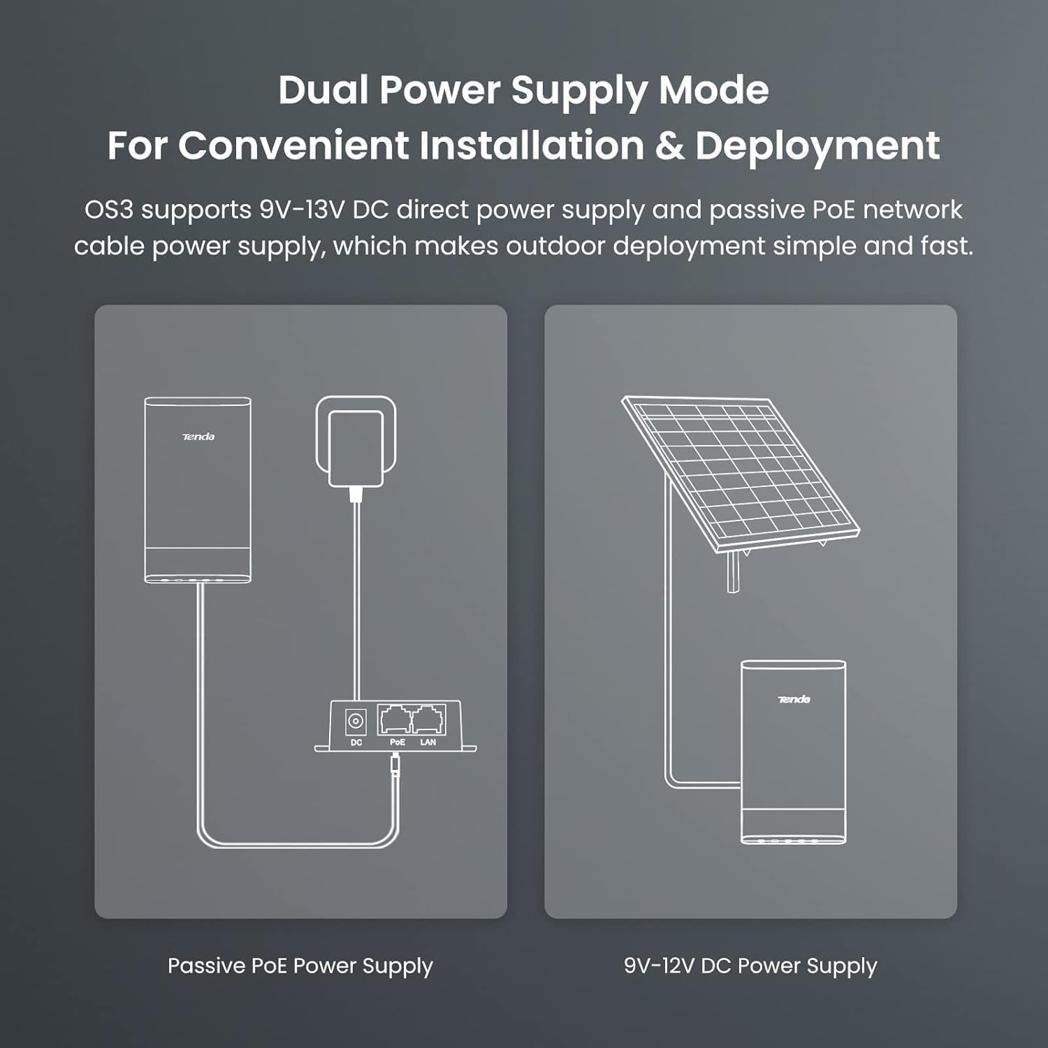 يدعم نظام التشغيل OS3 خيار تزويد الطاقة عبر تقنية PoE السلبية بقدرة 12 فولت و1 أمبير، بالإضافة إلى خيار تزويد الطاقة عبر التيار المستمر بقدرة 12 فولت و1 أمبير. وهذا يُسهّل على المهندس نشر الجهاز بمرونة.