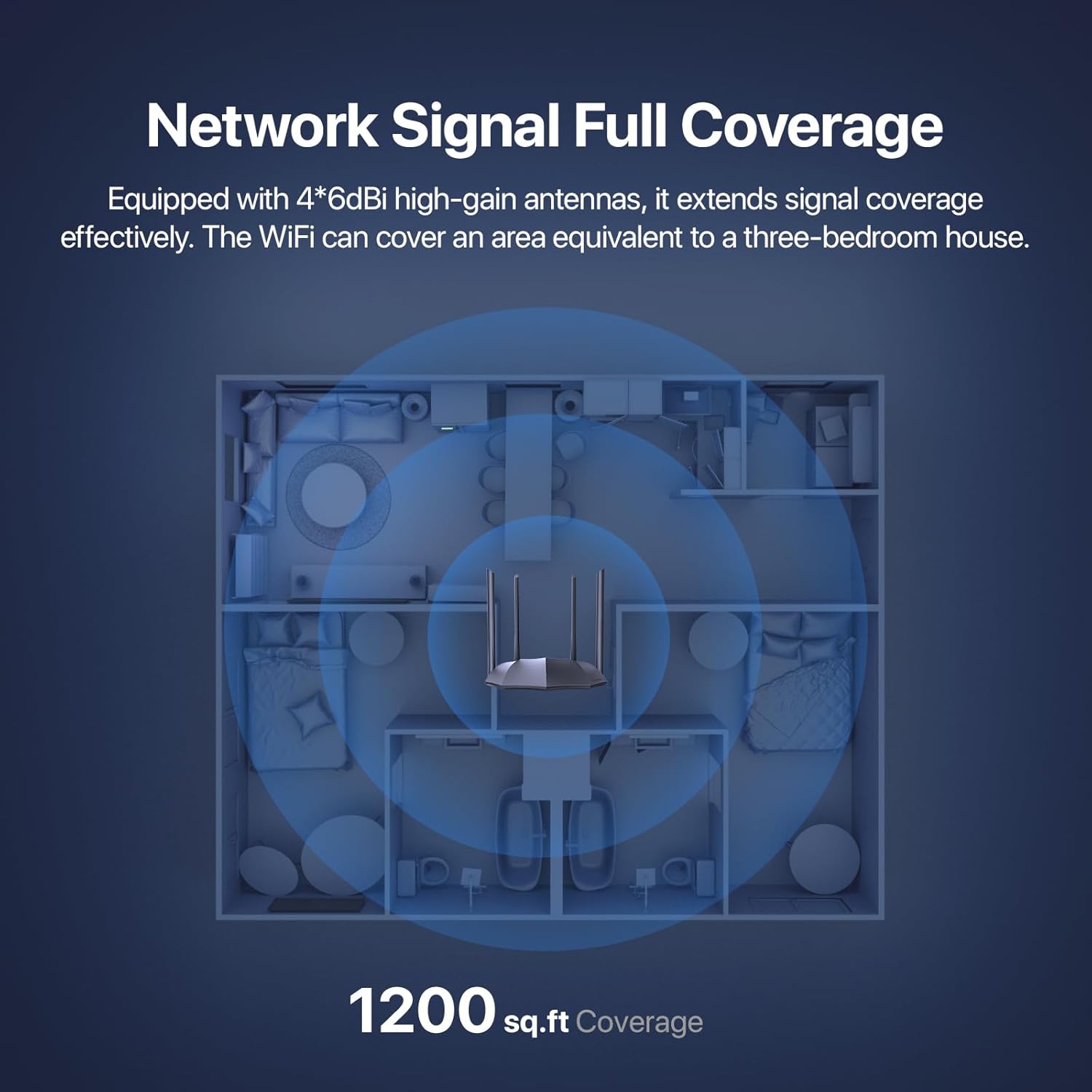 𝐒𝐭𝐫𝐨𝐧𝐠 𝐖𝐢𝐅𝐢 𝐒𝐢𝐠𝐧𝐚𝐥 𝐂𝐨𝐯𝐞𝐫𝐚𝐠𝐞— مزود بأربعة هوائيات قوية بقدرة 6 ديسيبل وتقنية Beamforming، يوفر جهاز التوجيه اللاسلكي AC6 إنترنت عالي السرعة في جميع أنحاء منزلك