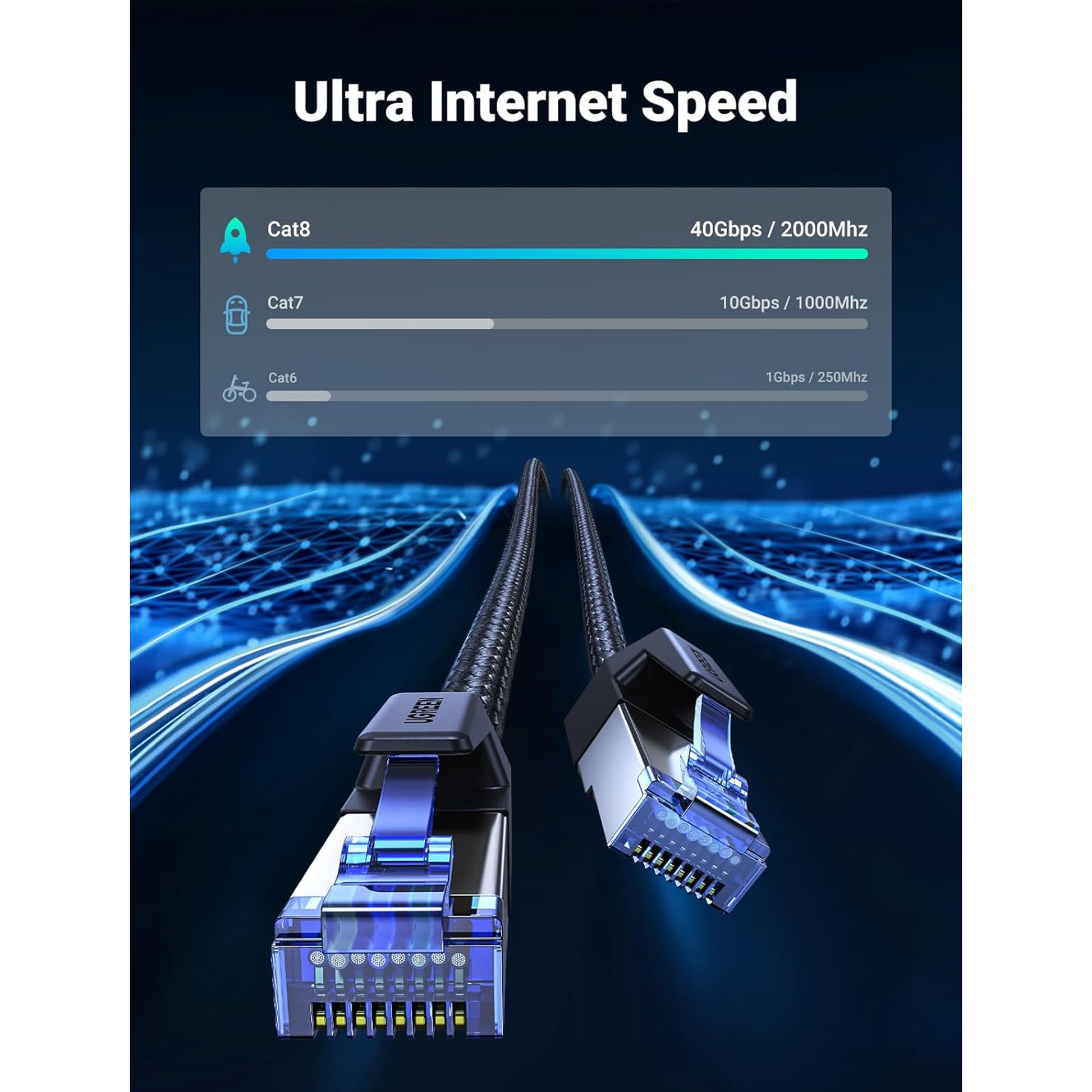 كابل UGREEN CAT8 محمي، دائري، مضفر، مزود بمقابس معيارية