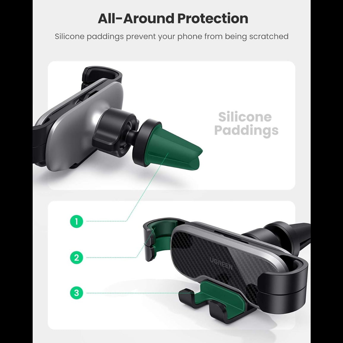 UGREEN Retractable Car Air Vent Holder adopts 5 clip arms to grip the phone more firmly and secures it in position even over bad roads. The soft rubberized cushions on the prongs prevent this Gravity Phone Clip Holder leaving scratches to your valuable car air vents.