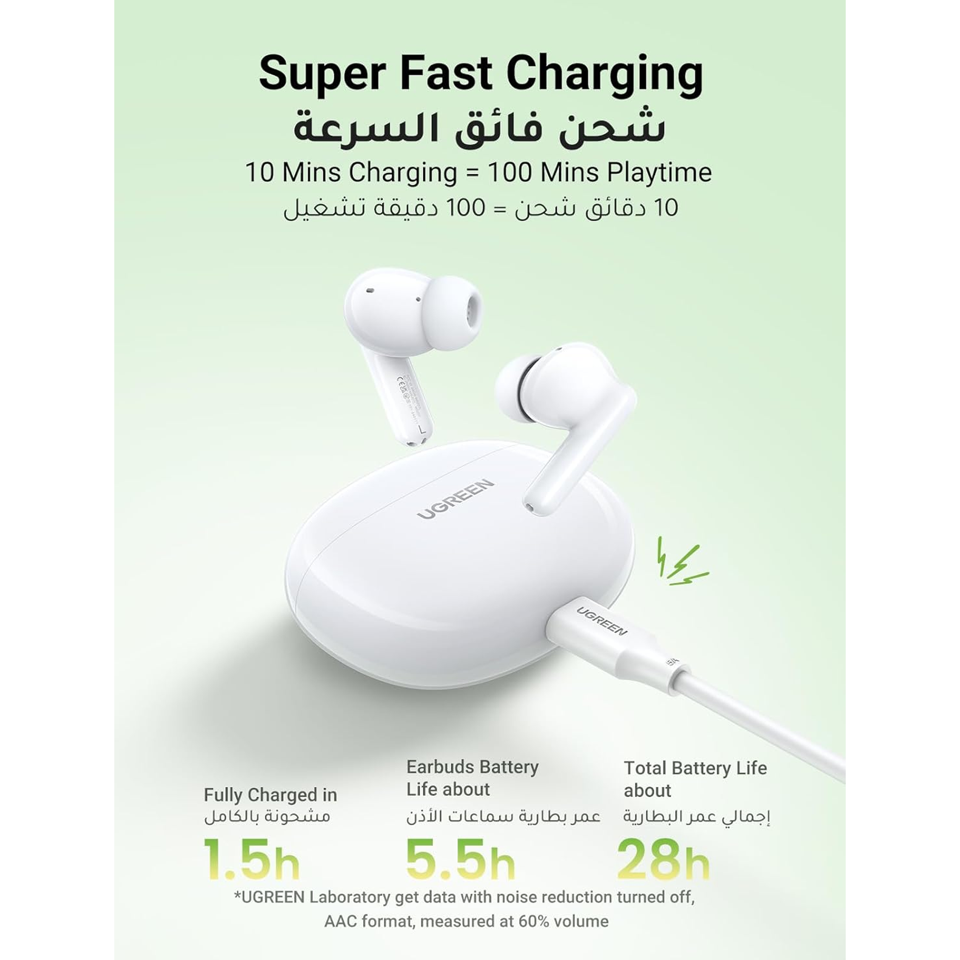 Charge 10 Mins, Play 100 Mins The usage time of a single earbud is 5.5 hours, and it can be used for up to 28 hours when used with the charging case (equivalent to playing about 420 songs or 14 movies). The USB C port of the wireless earbuds supports fast charging, and can be fully charged in 1.5 hours.
