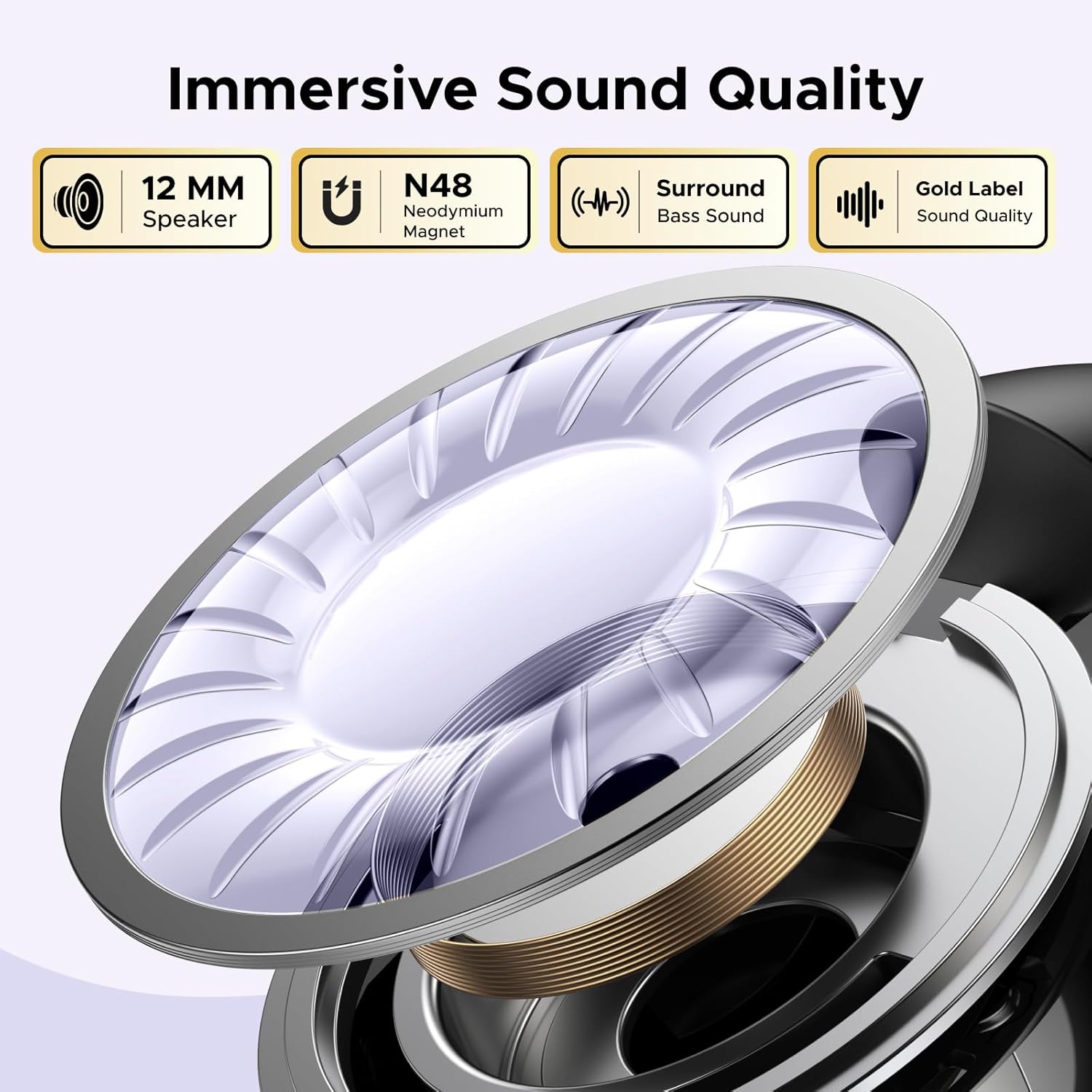 Precision-tuned 12mm dynamic drivers with composite polymer diaphragms deliver deep bass, rich mids, and crisp trebles.