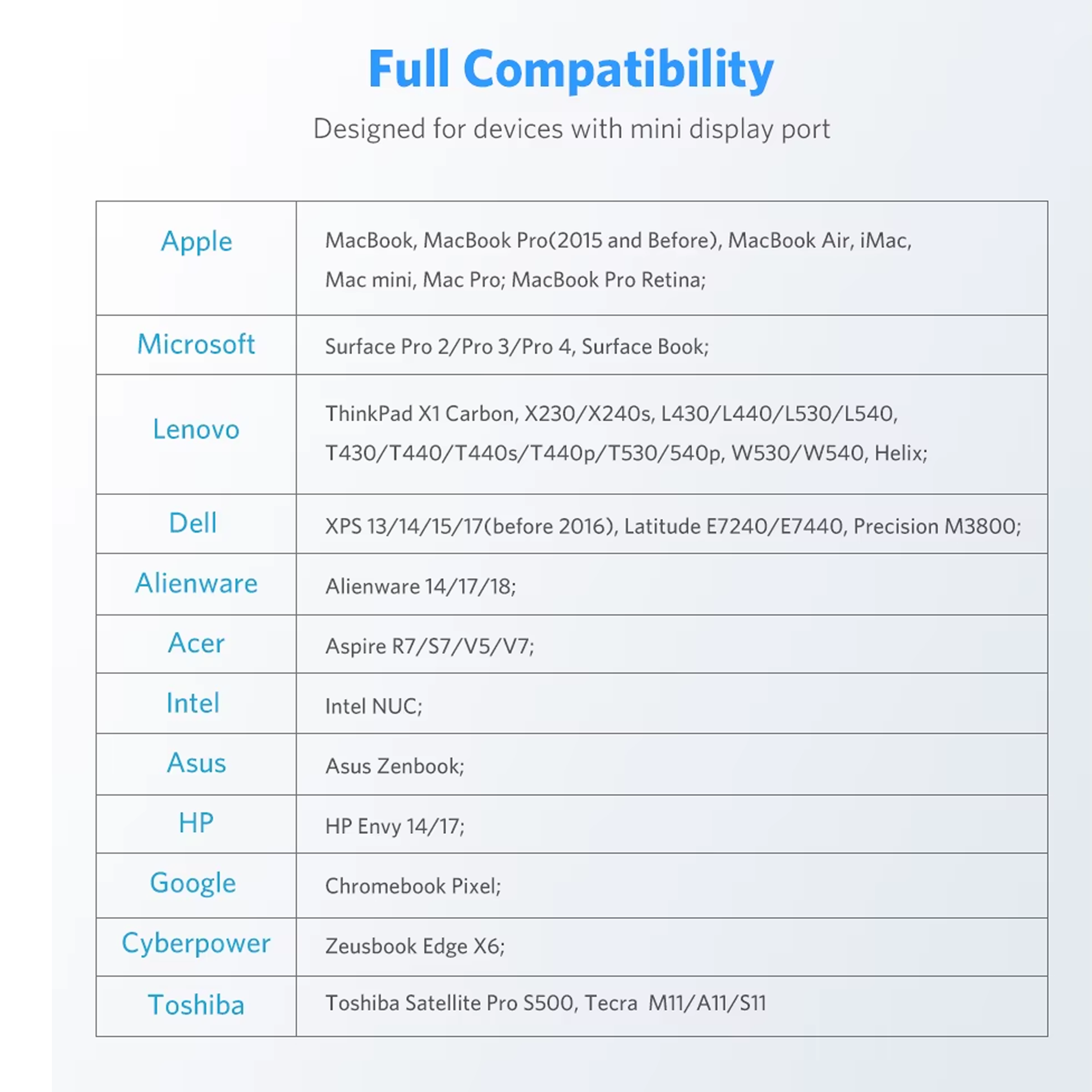 Compatibility: Compatible with ThinkPad X1, DELL XPS14z, XPS15, MacBook AIR, MacBook Mac mini, iMac MB413/MB418/MB420/MB466/MB467/MB470/MB471 and so on. NApple devices released before April 2010 do not support audio out and will not transmit sound from Mini DisplayPort. Mini DisplayPort that supports both audio and video is only available for Apple devices that are released after April 2010. Please make sure your device is compatible before purchasing this product.