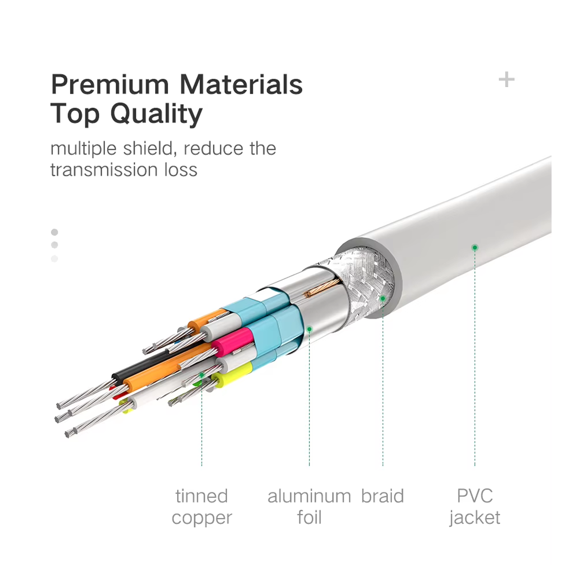 Material: Triple shielding, oxygen-free copper and gold-plated connectors resist corrosion, provide rigidity, and improve the signal performance.