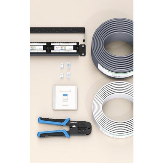 Network socket with frame of Ugreen, single with RJ45 port in white color. It is the most common type of socket for connecting ethernet cables as it has 8 wires, unlike RJ11 sockets which have 4. For this reason, an RJ45 cable cannot be connected to an RJ11 socket, but the opposite is possible.