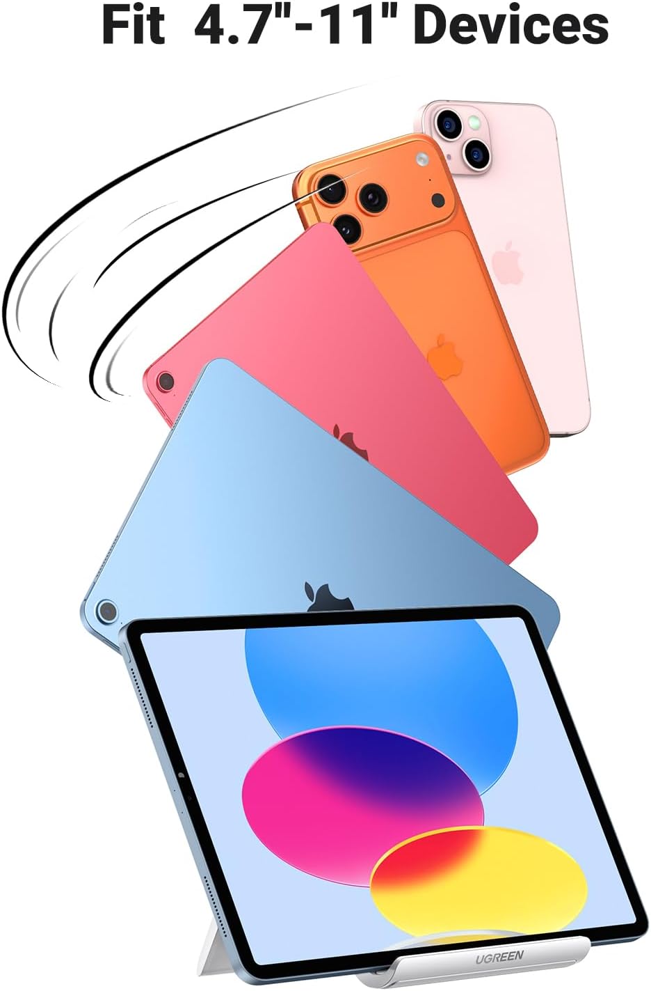 Wide Compatibility: This tablet stand adjustable can fit for 4 to 11 inch tablet, cell phone and E-reader with Max thickness of 0.55" (including its case). Compatible for Apple iPad 9.7 inch, iPad 10.2" 2019, iPad Pro 11-inch 2020, iPad mini 2 3 4 5 Wi-Fi, iPad Air 2, iPhone 17 16 15 14 13 12 11 Pro Max, iPhone 12 mini, the new iPhone SE 2020, iPhone XR X XS 8 Plus 6 7 6S, Samsung Note20 S20 Ultra S10 S9 S8 Note 10 9 8 android phones