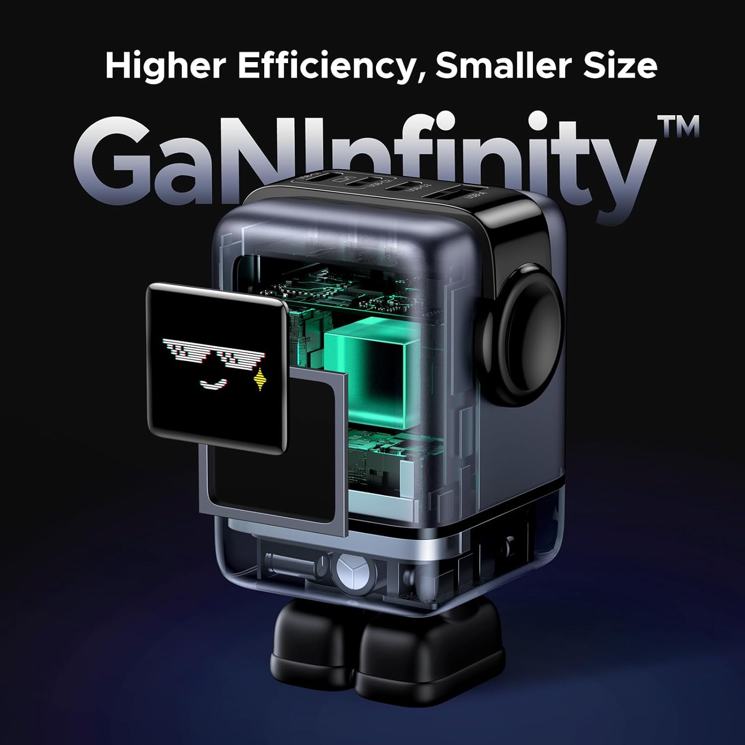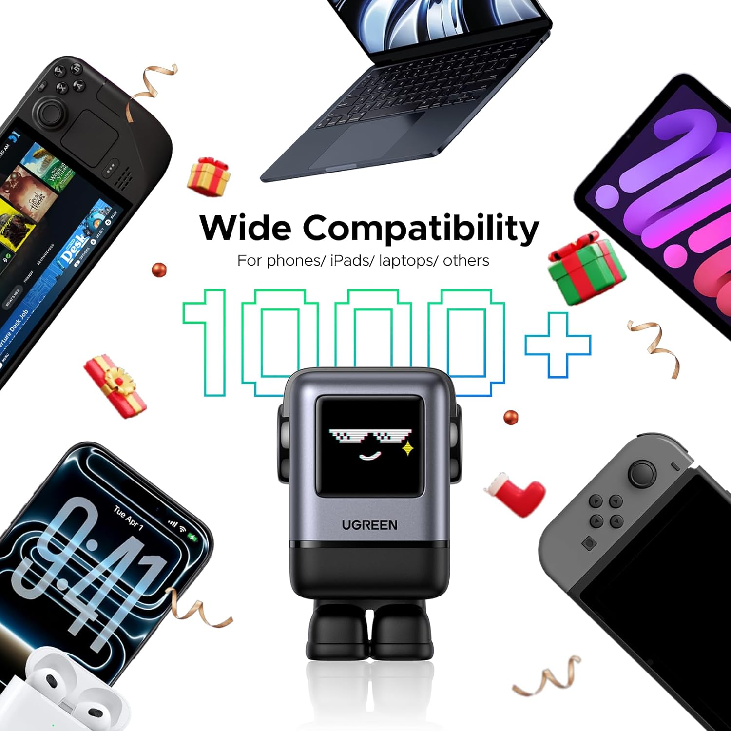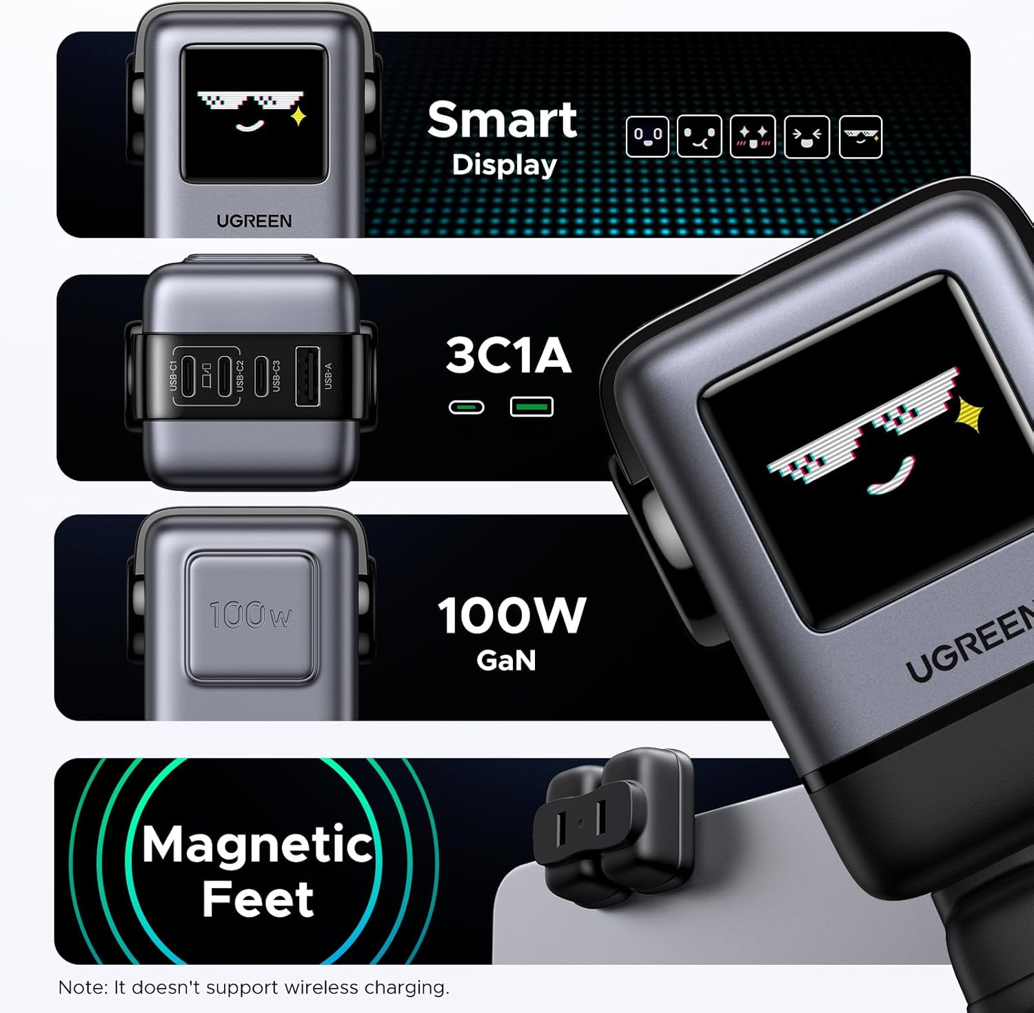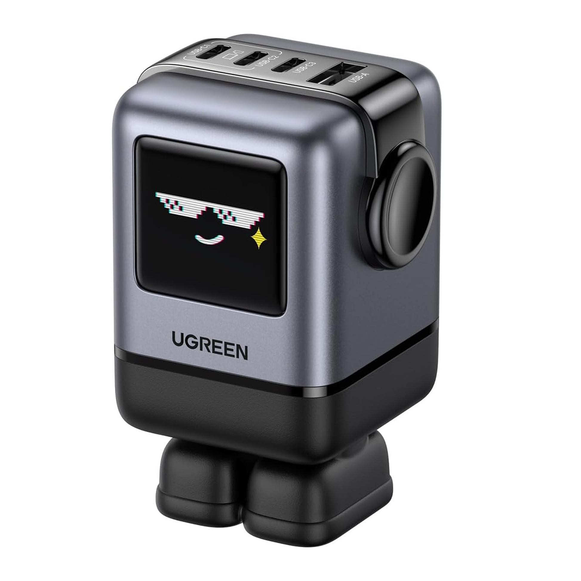 تصميم روبوت مميز: شاحن UGREEN من سلسلة الإبداع، بتصميم روبوت، وشاشة TFT مطورة من شاشة LED، مما يتيح له عرض تعابير أكثر جاذبية حسب حالة الشحن. قواعده مغناطيسية لتثبيته على أجهزة الكمبيوتر المحمولة دون أن يفقده (ملاحظة: ستظهر التعابير فقط عند تشغيل الجهاز).